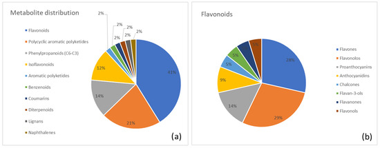 (a) Distribution of metabolite classes identified in Cascara. Each slice represents the percentage of annotated metabolites (MSI level ≥ 2) assigned to a given class, according to the structural classification pipeline described in the Methods (GIN-based hierarchical classification). (b) Detailed subdivision of the flavonoid superclass in Cascara into the corresponding annotated subclasses. Values are expressed as the percentage of flavonoid metabolites belonging to each subclass.