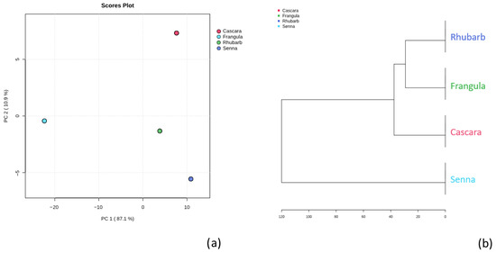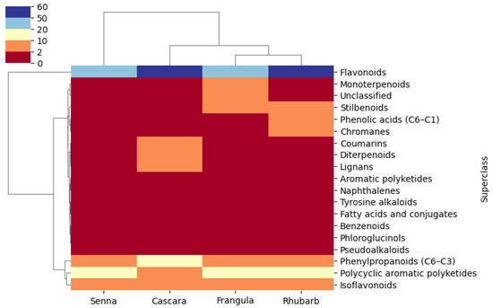 The Venn diagram (Figure 1) further indicated that Cascara and Frangula, belonging to the same family, were similar to each other and showed 21 compounds in common with ten of them characteristic only of these two species. On the other hand, Senna and Rhubarb, seemed to have some metabolites in common, specifically 13 compounds, of which five were exclusive of these two species.