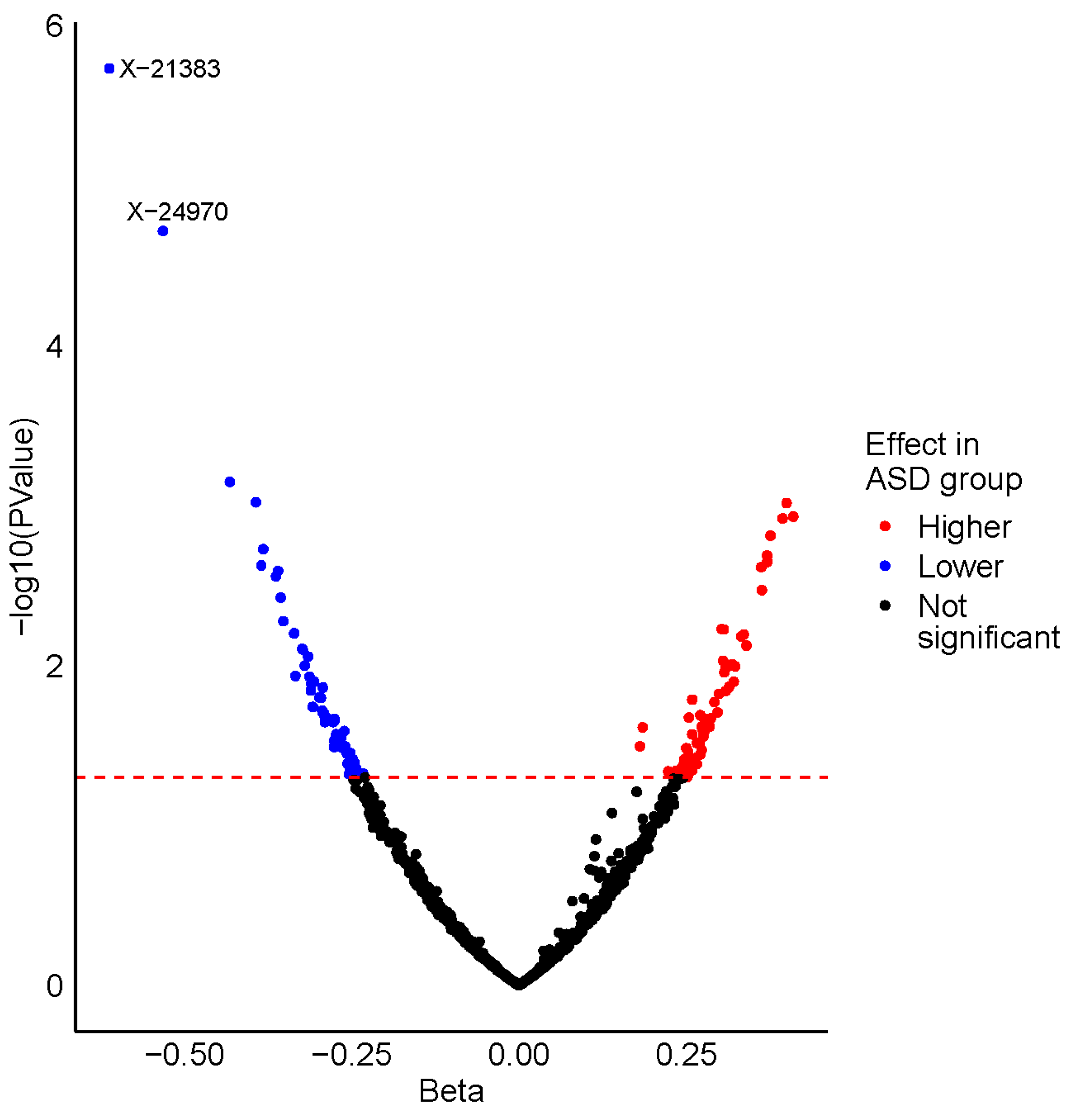 | ASD vs. control | X-21383 | −0.61 | 0.13 | 1.85 × 10−6 | 0.002 |