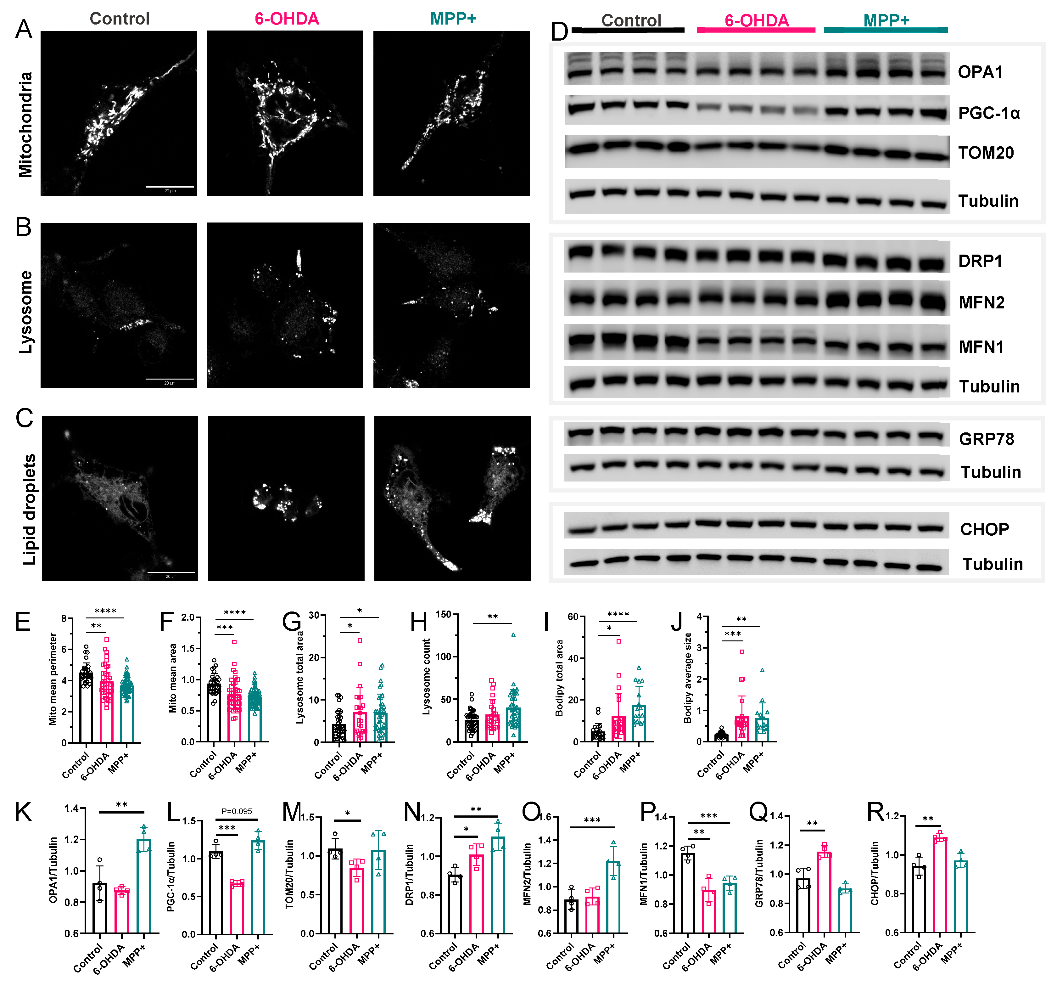 3.6. Organelle Stress Phenotypes Reveal Both Shared and Divergent Features in 6-OHDA and MPP+ Models