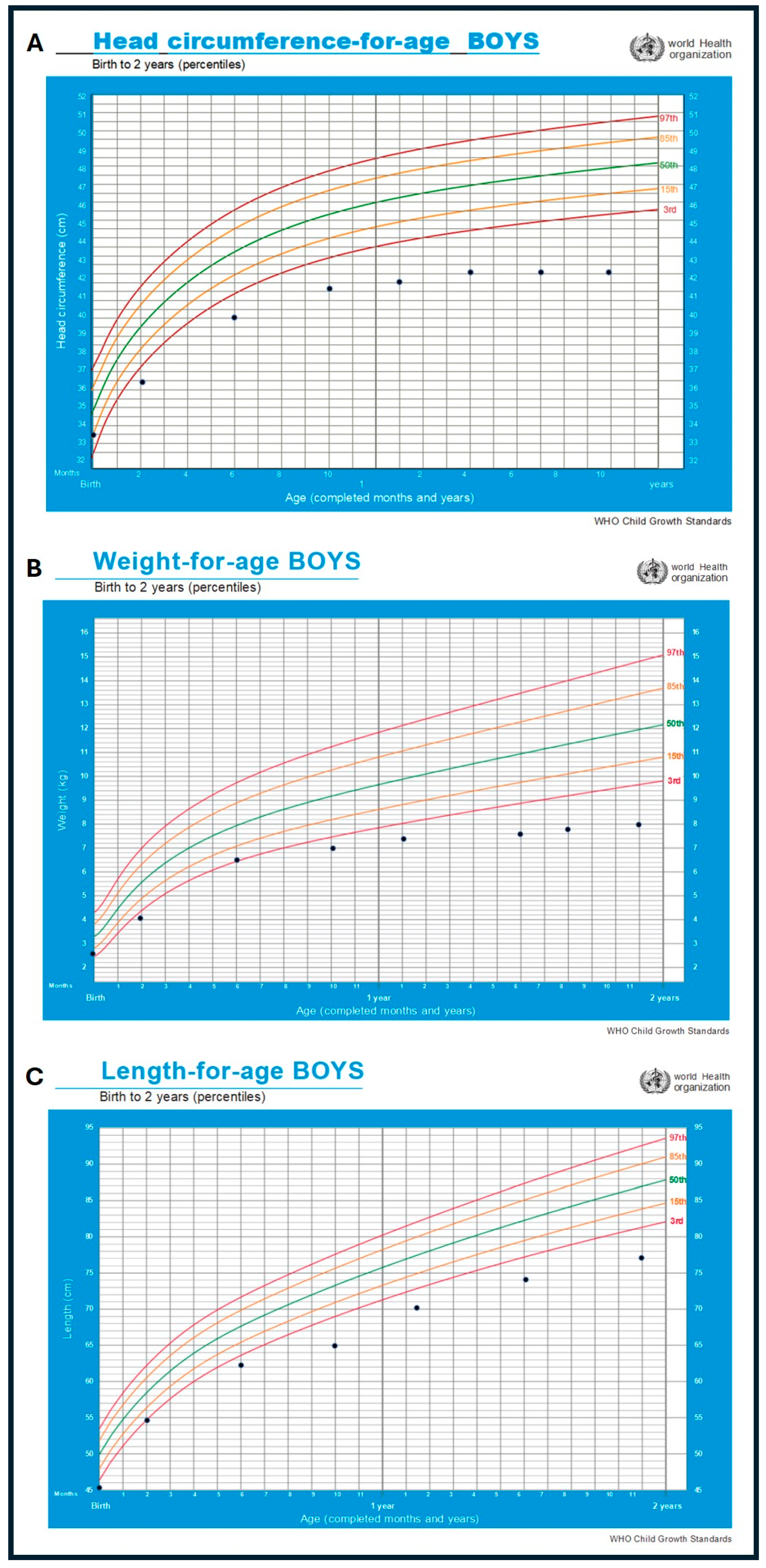 | Head circumference | Below 3rd centile from early infancy; decelerating head growth (microcephaly) | Infancy/follow-up | WHO growth standards for boys 0–2 years |