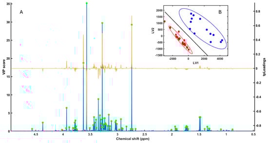 (A) VIP (blue line) and tpLoadings (orange line) values obtained from the PLS-LDA analysis of HR-MAS NMR spectra from Arbacia lixula and Paracentrotus lividus samples. Green dots indicate the spectral peaks with the highest VIP values, which were subsequently selected for the SPA (Subwindow Permutation Analysis) to further rank and select discriminant regions. (B) PLS-LDA score plot (LV1 vs. LV2) showing sample clustering according to species: blue circles correspond to A. lixula and red diamonds to P. lividus. The continuous line corresponds to the linear discriminant boundary in the PLS-LDA model; samples on each side of the line are assigned to one species or the other according to the sign of the discriminant function. Ellipses indicate the 95% confidence regions for each species cluster, illustrating within-group dispersion.
