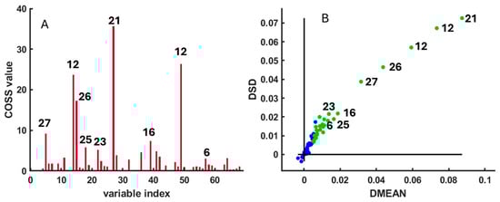 (A) COSS (Conditional Synergistic Score) values used to identify the most relevant spectral peaks differentiating Arbacia lixula and Paracentrotus lividus samples. (B) DMEAN versus DSD scatter plot. Variables with the highest discriminatory power are highlighted as green circles, whereas less relevant variables are shown as blue circles. The numbers appearing in the figures correspond to the compounds assigned in Supplementary Table S1.