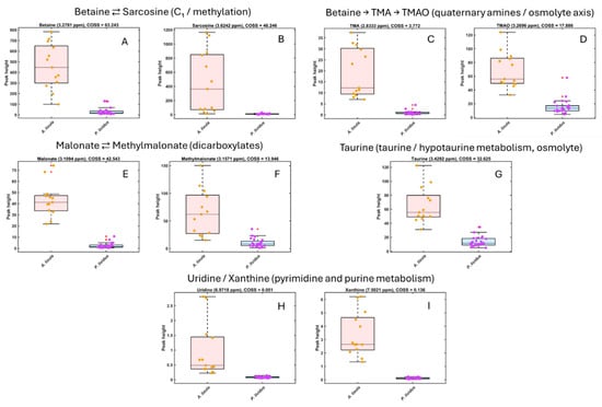 Boxplots of normalized HR-MAS 1H NMR peak intensities for key metabolites enriched in Arbacia lixula gonads. Metabolites are grouped according to known metabolic relationships. (A,B) Betaine and sarcosine illustrate the C1/methylation axis (betaine ⇄ sarcosine). (C,D) Betaine, trimethylamine (TMA) and trimethylamine N-oxide (TMAO) represent the quaternary-amine osmolyte/microbiota axis (betaine → TMA → TMAO). (E,F) Malonate and methylmalonate belong to the dicarboxylate/propionate-related pool (malonate ⇄ methylmalonate). (G) Taurine is a major osmolyte in the taurine/hypotaurine metabolism. (H,I) Uridine and xanthine are markers of pyrimidine and purine metabolism, respectively. Boxplots show the distribution of signal intensities for A. lixula (orange) and P. lividus (purple); dots represent individual urchin samples.