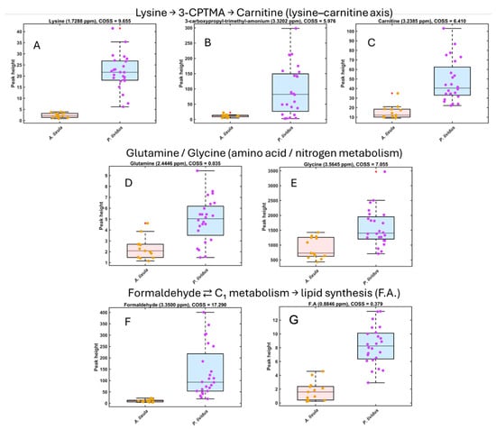 Boxplots of normalized HR-MAS 1H NMR peak intensities for key metabolites enriched in Paracentrotus lividus gonads. Metabolites are grouped according to known metabolic relationships. (A–C) Lysine, 3-carboxypropyl-trimethylammonium (3-CPTMA) and carnitine illustrate the lysine–carnitine axis (lysine → 3-CPTMA → carnitine). (D,E) Glutamine and glycine are representative amino acids within nitrogen and amino-acid metabolism. (F,G) Formaldehyde and the fatty acid (F.A.) signal reflect one-carbon intermediates feeding into energy and lipid metabolism (formaldehyde ⇄ C1 metabolism → lipid synthesis). Boxplots show the distribution of signal intensities for A. lixula (orange) and P. lividus (purple); dots represent individual urchin samples.