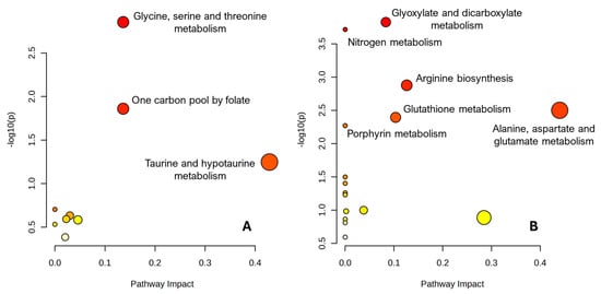 Pathway topology analysis of HR-MAS NMR metabolite sets using MetaboAnalyst. Each bubble represents a KEGG metabolic pathway, plotted according to its pathway impact (x-axis) and the statistical significance of the enrichment (−log10 of the raw p-value, y-axis). Bubble size is proportional to the number of matched metabolites in each pathway and bubble colour reflects the p-value (from yellow, less significant, to red, more significant). (A) Pathways associated with metabolites enriched in Arbacia lixula. (B) Pathways associated with metabolites enriched in Paracentrotus lividus. Full pathway names, hit numbers and statistics are provided in the Supplementary Tables S1 and S2.