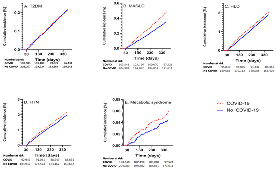Among those with COVID-19, the incident rates for the respective outcomes were: 211 of 102,685 (0.21%) for T2DM; 1972 of 93,041 (2.12%) for HTN; 1906 of 95,941 (1.99%) for HLD; 475 of 102,632 (0.46%) for MASLD; and 60 of 103,654 (0.06%) for MetS. Cumulative incidence curvesvisually shown in Figure 1.