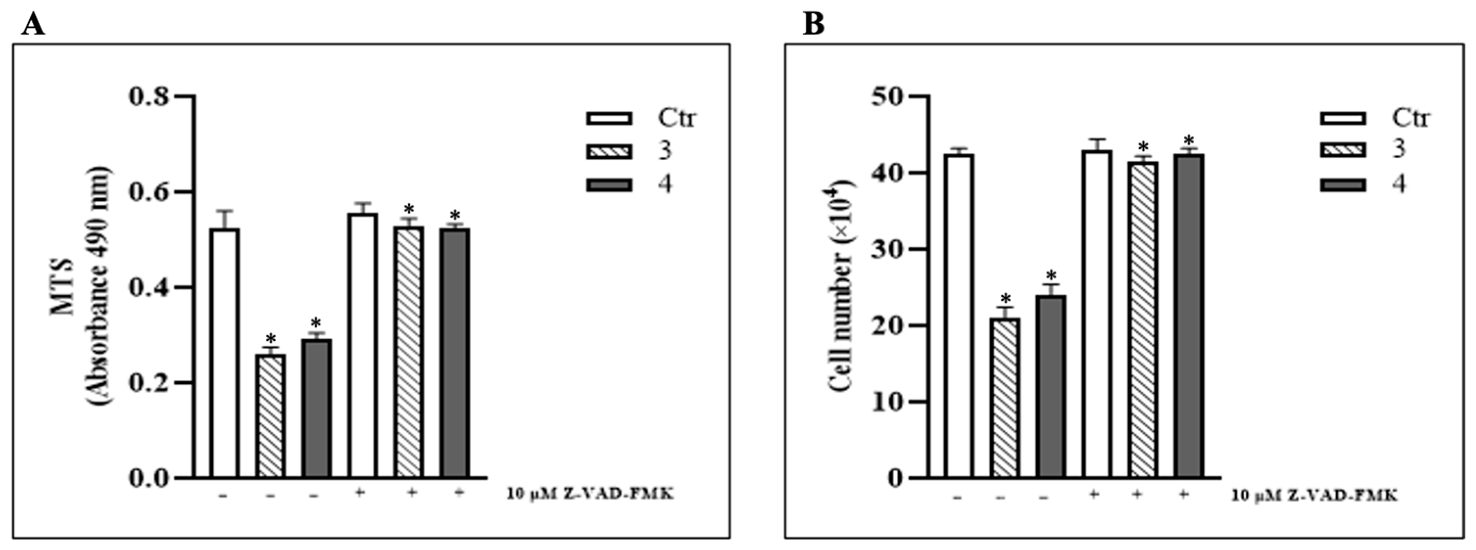 Figure 3. T. borchii extracts induce apoptosis in HCT 116 cells. 10 µM Z-VAD-FMK were added to the culture medium 1 h prior to the addiction of T. borchii extracts (3 and 4) and maintained throughout the experiment. (A) Cell proliferation was assayed by MTS, 24 h after treatment with T. borchii extracts (3 and 4) at 100 µg/mL. The data are expressed as means ± S.D. (n = 8; * p < 0.05 with respect to cells treated with T. borchii extracts 3 and 4 alone). (B) Cell number was determined by Trypan Blue exclusion test 24 h after treatment with the four T. borchii extracts (3 and 4) at 100 µg/mL. The data are expressed as means ± S.D. (n = 3; * p < 0.05 with respect to cells treated with T. borchii extracts 3 and 4 alone).