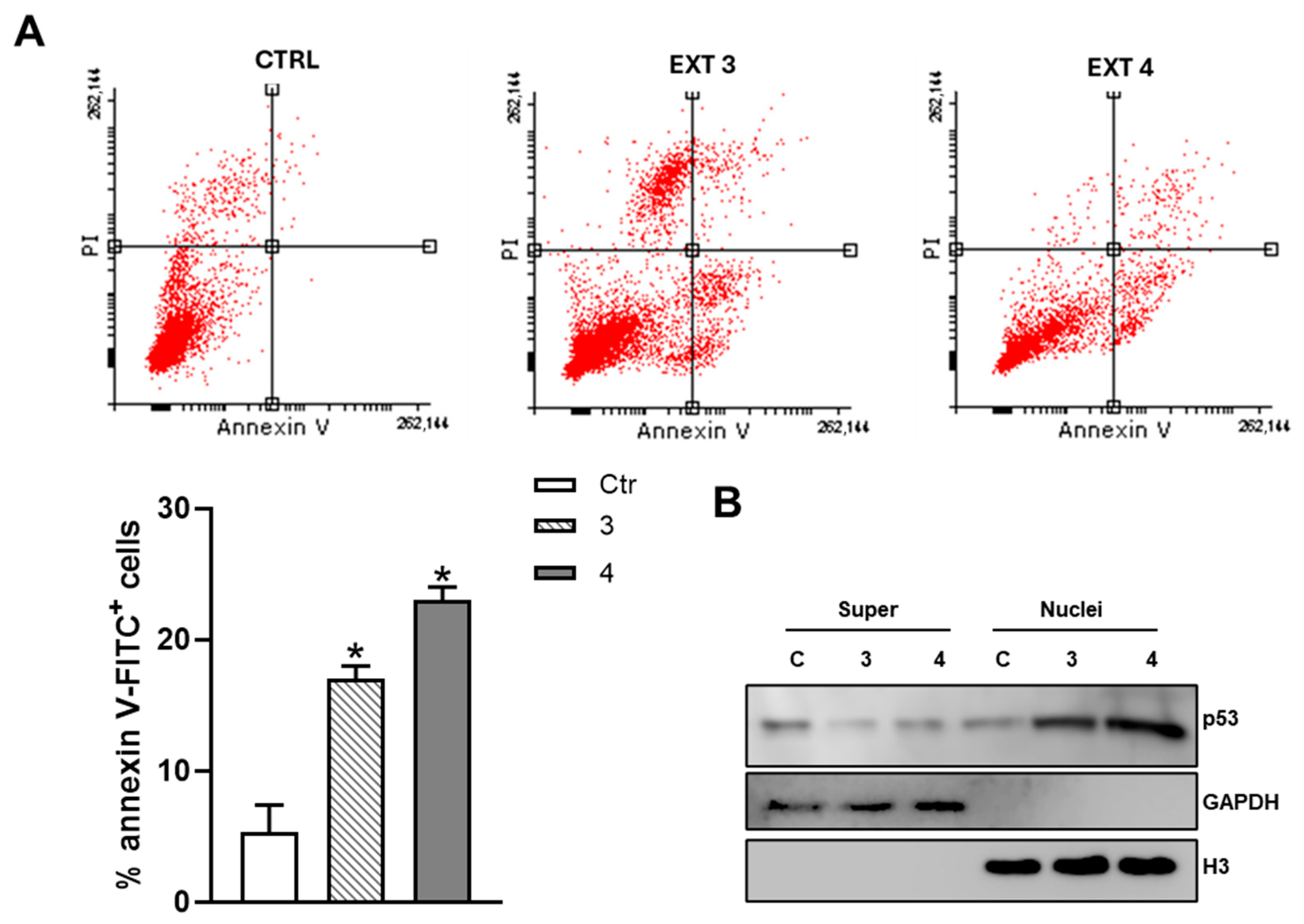 Figure 5. T. borchii treatment promotes cell death through the translocation of p53 into the nuclei of HCT 116 cells. (A) HCT 116 cells were treated with the extracts of T. borchii (3 and 4) at 100 µg/mL for 24 h and stained with annexin V-FITC and propidium iodide (flow cytometry dot plots). Fluorescence was analyzed by a FACScalibur instrument. The percentages of staining-positive cells were evaluated using WinMDI version 2.8 software. The data show the percentage of total annexin V-FITC-positive cells and expressed as means ± S.D. (n = 3; * p < 0.05). (B) HCT 166 cells were treated with 100 µg/mL extracts 3 and 4 of T. borchii for 6 h. p53 protein content was detected by Western blot on supernatant and nuclear protein extracts. The immunoblots reported are representative of four experiments that gave similar results. GAPDH and H3 were used as purity controls.