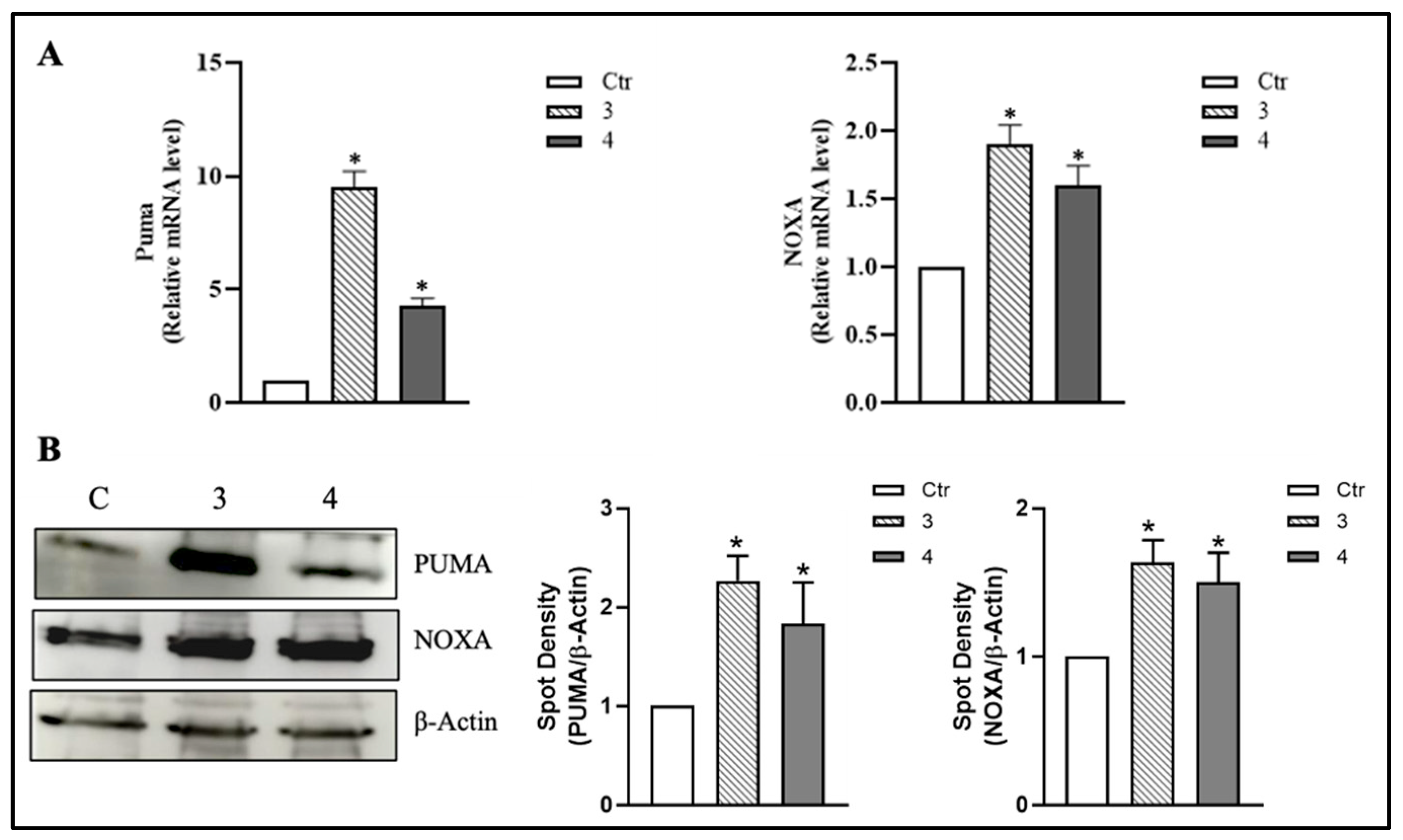 Figure 6. Treatment with T. borchii extracts leads to the upregulation of the pro-apoptotic proteins PUMA and NOXA in HCT 116 cells. (A) Relative mRNA levels of PUMA and NOXA were analyzed by RT-qPCR. The data are expressed as means ± S.D. (n = 4; * p < 0.05 vs. control). (B) HCT 116 cells were treated with 100 µg/mL of T. borchii extracts (3 and 4) for 24 h. PUMA and NOXA levels were detected by Western blotting on total protein extracts. The immunoblots reported are representative of four experiments that gave similar results. β-Actin was used as a loading control. The software Quantity One (Bio-Rad) was used to calculate density of immunoreactive bands. The data are shown as a ratio of protein/β-Actin. The data are expressed as means ± S.D. (n = 3; * p < 0.05).