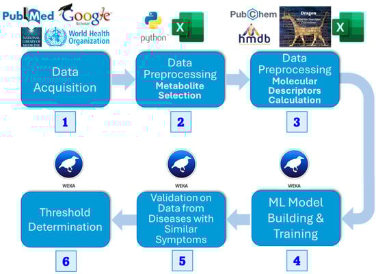 We collected plasma metabolic data from open sources, including PubMed, Google Scholar, and the National Library of Medicine. Significant metabolites were selected using univariate t-test analysis (p ≤ 0.05). Then, we retrieved the same number of random metabolites from the Human Metabolite Database (HMDB) [23], preprocessed them in the same manner, and combined them with the dysregulated metabolites. Next, we calculated a set of molecular descriptors using the e-Dragon software, version 5.4 [24], and then performed dimensionality reduction using CfsSubsetEval and BestFirst search from the Waikato Environment for Knowledge Analysis (WEKA) [25]. Utilizing the prepared dataset, we trained several machine learning algorithms in Python, version 3.13.5, as implemented by Scikit-Learn, version 1.7.2 [26], using 5-fold cross-validation. After selecting the best ones, we validated them using metabolic data from diseases with PASC-like symptoms. We then determined a threshold to convert the classifier’s output score into a final, definitive class prediction, striking a balance between sensitivity and specificity.