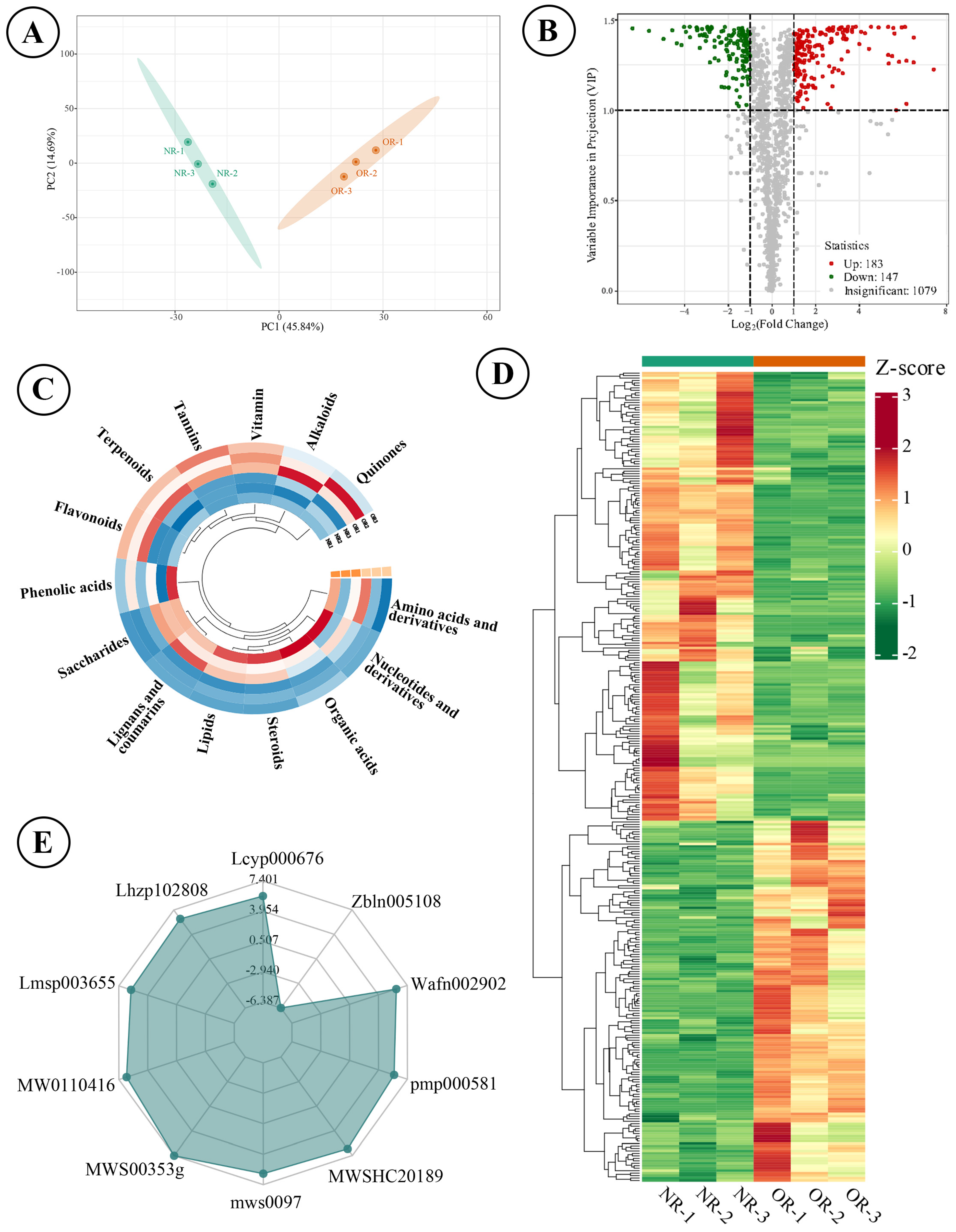 2.4. Measurement and Analysis of Widely Targeted Metabolomics Between Connected Rhizomes of NRs and ORs of D. roosii