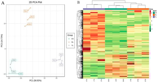 PCAof metabolome of CK, GL, and YL corn kernels (A). Heatmap analysis of metabolites in CK, GL, and YL corn kernels (B).
