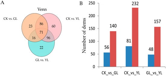 Venn diagram analysis of CK, GL, and YL (A). Number of dems in CK, GL, and YL (B).