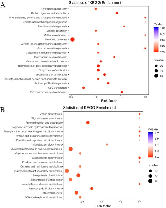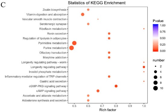 A bar chart was constructed based on the enrichment levels of differential metabolites and differential gene pathways. For the comparison between the control group and the germinating stage, DEGs were mapped to 306 KEGG pathways (Appendix A Figure A2). Among them, the largest number of DEGs were mapped to metabolic pathways (ko01100, with 1084 genes).