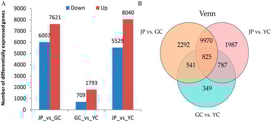 Analysis of number of DEGs in JP, GC, and YC (A). Venn diagram analysis of DEGs in JP, GC, and YC (B).