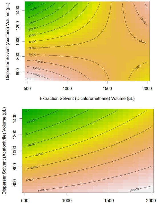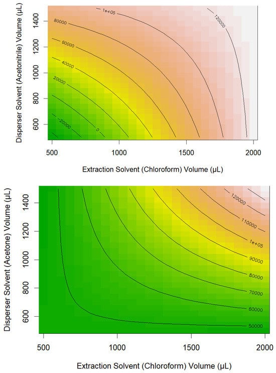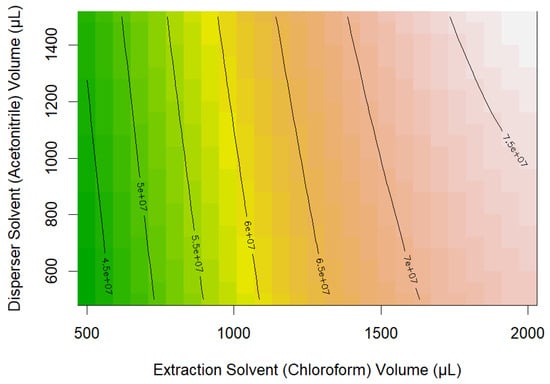 The next step was the selection of suitable disperser solvent candidates for investigation. To form a distinct cloudy solution, the disperser solvent needs to be miscible with both the extraction solvent and the aqueous phase. This step enhances the extraction efficiency by increasing the surface contact between the aqueous phase and the organic phase [41]. Accounting for this key requirement, acetone, acetonitrile, and methanol were evaluated as disperser solvents in this study [35,42,43].