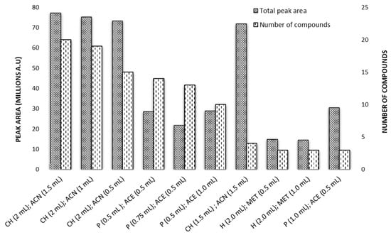 A full factorial experimental design (based on the four variables and levels outlined in Table 1) would have given rise to 225 combinations. In order to select and investigate a more manageable number of experiments, a D-optimal design was employed in order to appropriately model all of the desired factors (and interactions) [44]. This approach significantly reduces the number of experiments required for the optimisation of parameters, while still giving comparable precision to a full factorial design. As such, a D-optimal experimental design was devised to select 60 different combinations of the factors of interest (refer to Table S2 in the Supplementary Materials for details of these) which could then be used to find the optimal combination of levels to maximise extraction efficiency and ability across the analytes of interest. Combinations involving pentane as the extracting solvent did not yield a cloudy solution. Instead, a thin organic layer was retained on top of the wine sample. This likely results from the higher volatility of pentane compared to the other solvents [45]. However, other combinations formed distinct cloudy solutions, indicating their ability to disperse easily through the aqueous phase and achieve greater extraction efficiency than pentane. Combinations such as chloroform–acetone, chloroform–acetonitrile, DCM–acetone, and DCM–acetonitrile not only gave the desired cloudy mixture, but also exhibited clear separation of the organic layer. To determine the most important factors for extraction efficiency, the relative peak areas of the 36 compounds of interest were determined using the Agilent MassHunter software (version 10.0, Agilent) and were further evaluated using R software (version 4.2.3). Three of the 36 target compounds (β-citronellol, trans-2-hexen-1-ol, and geraniol) were not detected in the wine extracted using any of the 60 solvent combinations.