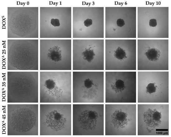 Representative brightfield images of spheroids derived from the four types of MCF-7 cells (DOXS and DOXA 25, 35, and 45 nM) over a 10-day culture period.