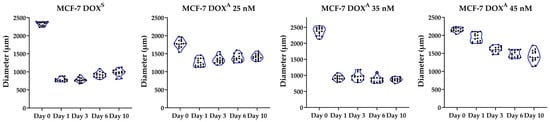 Characterization of the spheroids was performed following the MISpheroID Consortium guidelines []. This characterization was conducted by assessing the respective diameters at multiple time points (days 0, 1, 3, 6, and 10) (Figure 3). Data on the circularity and compactness of the constructs are shown in Supplemental Figure S2. MCF-7 spheroids exhibiting distinct levels of DOX adaptation demonstrated different morphologies. By day ten, most DOXS and DOXA 35 nM cells had aggregated into single, spheroid structures. However, a significant fraction of DOXA 25 nM and particularly 45 nM cells failed to fully aggregate, resulting in larger and less compact aggregates. Overall, diameters exhibited minimal variation within levels of DOX adaptation, demonstrating the reproducibility of the formation procedure.