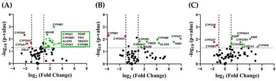 Differential gene expression of 92 DMEs in MCF-7/DOXA spheroids relative to parental MCF-7/DOXS spheroids ((A) MCF-7/DOXA 25 nM, (B) MCF-7/DOXA 35 nM, (C) MCF-7/DOXA 45 nM). Genes with a fold change > 2 (upregulated, shown in green) or <0.5 (downregulated, shown in red) and a p-value < 0.05 were considered significantly differentially expressed (N = 2).