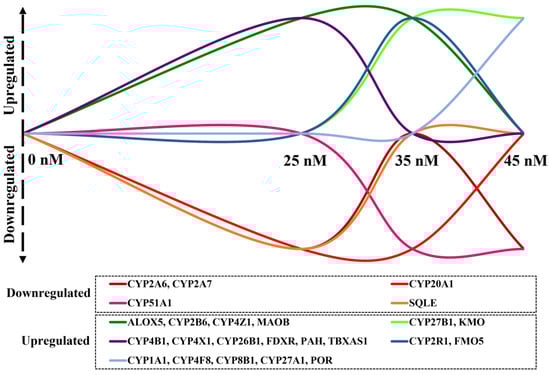 Among the ninety-two evaluated target genes, twenty-four were found to be differentially expressed in the different DOXA spheroids, comprising a total of fifteen CYPs and nine oxidoreductases. Notably, out of the twenty-four differentially expressed enzymes, five were downregulated, while the remaining nineteen were found to be upregulated (Figure 4). Several genes exhibited simultaneous upregulated expression in both DOXA 25 and 35 nM spheroids (i.e., CYP2B6, CYP4Z1, ALOX5, and MAOB), while others were found to be concurrently upregulated in 35 and 45 nM adapted spheroids (i.e., CYP27B1 and KMO). Interestingly, none of the examined genes was detected as simultaneously differentially expressed across the three levels of DOXA spheroids, suggesting a highly dynamic adaptative process in the early stages of DOX resistance acquisition. The transcript levels of certain genes showed particularly high levels of upregulation in adapted cells (fold change > 15), particularly for DOXA 35 nM and 45 nM cells, namely CYP2B6, ALOX5, CYP4Z1, KMO, and CYP4F8, respectively (Supplemental Figure S3).