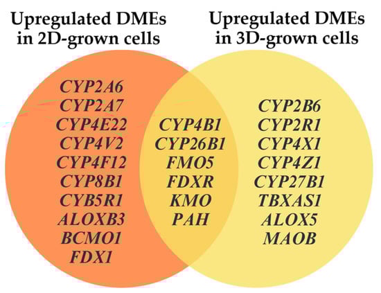 By comparing these results with our previous study analyzing DOXA 25 and 35 nM MCF-7 cells cultured in a monolayer, we identified a set of gene transcripts—CYP4B1, CYP26B1, FDXR, FMO5, KMO, and PAH—to be upregulated in cells cultured in both the 2D and 3D models (Figure 7) []. This overlap suggests that this specific group of enzymes may significantly contribute to subtherapeutic resistance to DOX in MCF-7 cells. Notably, several differences in DME expression profiles were still observed between the 2D and 3D setups (see also Supplemental Tables S6 and S7), highlighting the significant influence of cellular spatial organization on enzyme expression, as previously described [,].