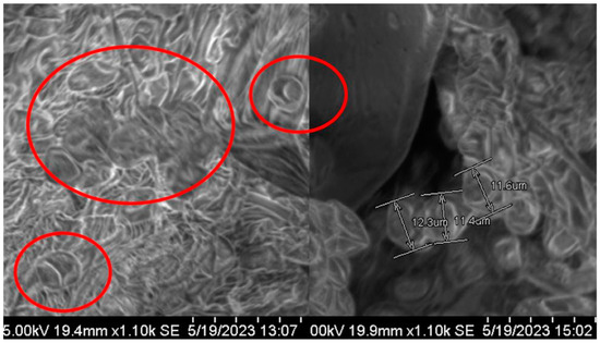 Figure 1. SEM images of B. papyrifera pollen captured at 50 µm resolution. Red circles indicate individual pollen, and double arrow lines show pollen diameter.