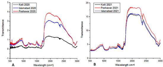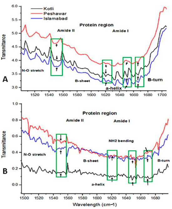 Figure 3. Location effect on FTIR spectra of pollen protein content collected in the spring 2020 and spring 2021: (A) Protein spectra of R1, R2, and R3 for pollen collected in 2020. (B) Protein spectra of R1, R2, and R3 pollen sampled in spring 2021. Green rectangles and black arrows show functional group comparisons.