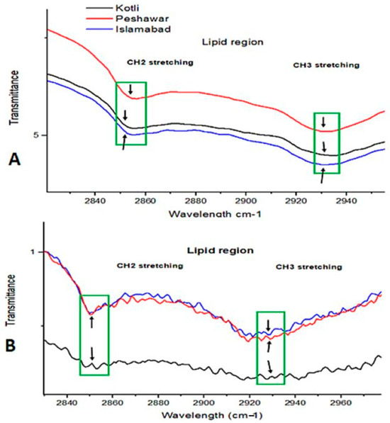 Figure 4. Seasonal and climatic effects on lipid region of pollen: (A) Spring 2020 pollen FTIR spectra for lipid region 2840 cm−1 to 2940 cm−1. (B) Spring 2021 pollen FTIR spectra for lipid region 2840 cm−1 to 2940 cm−1. Green rectangles and black arrows show functional group comparisons.