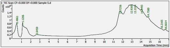 Figure 5. LC-MS/MS analysis of B. papyrifera pollen. The Y-axis shows charge to mass ratio for the ions of various compounds separated at different time intervals, while the X-axis denotes acquisition time in minutes. The sample run time is 17 min, with the highest peak at 13th minutes 12.9369. The analysis shows the variance in charge-to-mass ratios of ions in the pollen that make unique peaks. Peaks analysis reveals the presence of different compounds in the analyzed pollen (for details, see Table S4).
