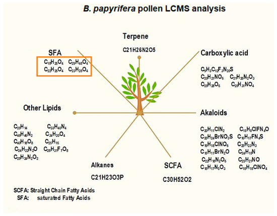 Figure 6. Schematic distribution of organic compounds in B. papyrifera pollen grains by LC-MS/MS analysis. Total compounds identified from the NIST database in the pollen samples were classified into 7 groups: alkanes, alkaloids, carboxylic acids, terpenes, other lipids, straight-chain fatty acids, and unsaturated fatty acids. Unsaturated fatty acids (marked in orange show the presence of allergenic compounds in the pollen grains of B. papyrifera.