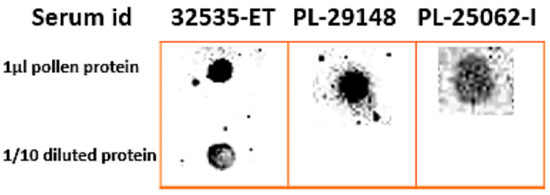Selected 13 serum 1:10 diluted samples in non-fat dry milk were cross-reacted with B. papyrifera pollen protein extracts in 1X PBS and 1:10 (1X PBS) diluted through dot blots. Three serum samples showed IgE binding with 1 µL pollen protein, and only one serum sample (32535-ET) showed IgE binding at 1:10 dilution. These three positive serum samples (Figure 7) were shortlisted for Western blotting to identify allergens in the pollen protein extracts.