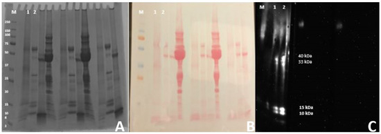 Figure 8. Western blot analysis of B. papyrifera-pollen protein: (A) B. papyrifera-pollen protein on a stained gel with 250 kDa pre-stained Precision Plus molecular weight marker proteins denoted as M, lane 1, and lane 2 shows B. papyrifera-pollen proteins. (B) Western blotting image of proteins on the nitrocellulose membrane stained with safranin red. (C) Anti-IgE binding with allergens on Western blot. The Western blot analysis depicts 4 allergen bands in lane 1 and lane 2, with primary antibody binding with 1:1000 diluted secondary antibodies.