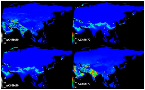 Figure 9. ACCESS1.0 based MaxEnt modeling of B. papyrifera growth occurrence in the years 2050 and 2070 in Asia. The figure shows habitat suitability for B. papyrifera in the years 2050 and 2070 through the ACCESS1.0 Coupled Model Intercomparison Project Phase 5 (CMIP5) dataset. AC represents ACCESS, 4.5 shows representative concentration pathway (RCP) 4.5, 8.5 shows representative concentration pathway (RCP) 8.5, and bi50 and bi70 denote bioclimatic variables in the year 2050 and 2070. The colored scale (0–1) on the right side of the map shows the suitability of locations for B. papyrifera-growth invasion in the future.