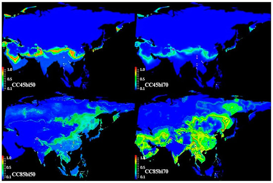 Figure 10. CCSM4-based MaxEnt modeling of B. papyrifera growth occurrence in the years 2050 and 2070 in Asia. The figure shows habitat suitability for B. papyrifera in the years 2050 and 2070 through the CCSM4 CMIP5 dataset. CC represents CCSM4, 4.5 shows representative concentration pathway (RCP) 4.5, 8.5 shows representative concentration pathway (RCP) 8.5, and bi50 and bi70 denote bioclimatic variables in the years 2050 and 2070. The colored scale (0–1) on the left side of the maps shows the suitability of locations for B. papyrifera-growth invasion in the future.