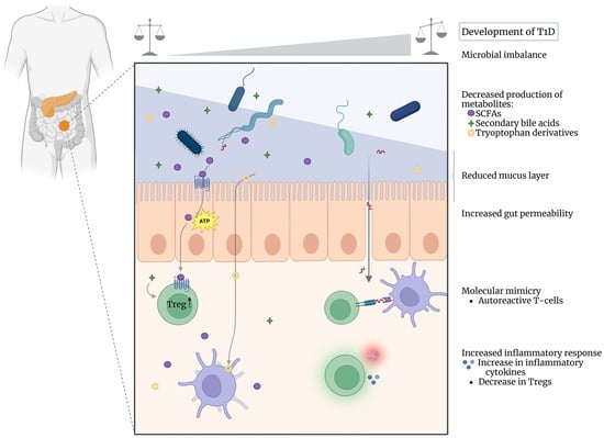 Schematic representation of the pathological mechanisms by which alterations in the gut microbiome can lead to T1D onset or exacerbate systemic inflammation and autoimmune responses. We visualized a spectrum from lower to higher risk of developing T1D, from left to right. Under homeostatic conditions (left side of the spectrum), a ’healthier’ and diverse microbiome produces a wide range of metabolites, such as SCFAs, secondary bile acids and tryptophan derivatives, fostering the intestinal barrier and leading to a more tolerogenic environment with stimulation of Treg differentiation. In contrast, a more imbalanced microbiome (right side of the spectrum) can perturb the production of microbial metabolites, and increase gut permeability with a reduced protective mucus layer. This leads to an enhanced inflammatory response with increased secretion of pro-inflammatory cytokines and decreased levels of intestinal Tregs, indicating a less tolerogenic environment. In addition, gut microbes that express peptides with similarities to pancreatic beta cell epitopes can trigger the activation of autoreactive T cells (via molecular mimicry). Altogether, these effects may lead to or exacerbate the autoimmune responses that drive beta cell destruction and the development of T1D. Figure created using BioRender (https://www.biorender.com/, accessed on 12 February 2025).