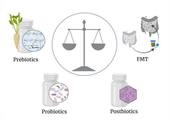 Several approaches can be used to modulate the gut microbiome and potentially influence the immune system and pathogenesis of T1D. These strategies encompass the rational use of (broad-spectrum) antibiotics, especially early in life; dietary interventions such as fiber-rich diets or specific dietary patterns; prebiotics that stimulate growth and function of beneficial bacteria; specific bacterial strains as probiotics or their metabolites (postbiotics); and fecal microbiota transplantation (FMT) (Figure 2). These interventions aim to reshape the gut microbiome, potentially mitigating immune dysregulation and influencing T1D progression through various mechanisms, including the production of SCFAs, improvement of gut barrier function, and modulation of host immune responses.