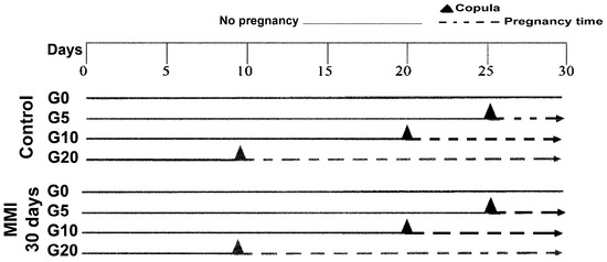 Scheme of experimental design. Control and methimazole (MMI)-treated female rabbits during pregnancy. Eight groups were used: control virgins (C0), control at day 5 of pregnancy (C5), control at day 10 of pregnancy (C10), and control at day 20 of pregnancy (C20), MMI-treated virgins (H0), MMI-treated at day 5 of pregnancy (H5), MMI-treated at day 10 of pregnancy (H10), and MMI-treated at day 20 of pregnancy (H20). All MMI-treated groups underwent 30 days of treatment, with days adjusted to before and after copula for each group. n = 6 per group.
