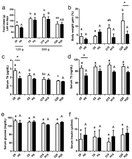 Food intake (a), body weight gain (b), and serum levels of T4 (c), T3 (d), glucose (e), and insulin (f) in virgin (0) and pregnant (5, 10, and 20 days) rabbits grouped into control (C) and MMI-treated (H) groups. Lowercase letters denote control groups and uppercase letters denote MMI-treated groups. Similar letters indicate no statistical significance, and different letters indicate p < 0.05. The differences between control and MMI-treated groups are denoted by * p < 0.05. Each group had n = 6, except n = 5, which was considered in H5 for insulin and H20 for T4, T3, glucose, and insulin levels. The amount of pellet food disposed of rabbits is shown in (a), considering pregnancy conditions.