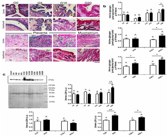 Glycogen content (a,b) and LDH expression (c) in the inter-implantation and implantation (i) sites from the central portion of right uterine horns of the virgin (0) and pregnant (5, 10, and 20 days) rabbits grouped into control (C) and MMI-treated (H) groups. Inter-implantation and implantation sites were considered at days 10 and 20 of pregnancy after placentation occurred. (a) Microphotographs of slides stained with periodic acid (PAS) indicating the different uterine tissues in the groups (days 0, 5, 10, and 20) and the placentas on day 20 of pregnancy showing glycogen content. Scale = 100 µm. Abbreviations: epithelium (e), giant cells (gc), spongioblast (sp), and glycogen cells (glyc). The liver was a positive tissue for LDH Western blot (c). Two-way ANOVAs were applied for each condition (inter-implantation sites during pregnancy, day 10 of pregnancy in the inter-implantation vs. implantation group, or day 10 of pregnancy in the inter-implantation vs. implantation group). Lowercase letters denote control groups and uppercase letters denote MMI-treated groups. Similar letters indicate no statistical significance, and different letters indicate p < 0.05. Differences between control and MMI-treated groups are denoted by * p < 0.05 and ** p < 0.01. Each group had n = 6, except in C0 for glycogen (n = 5).