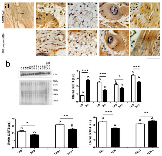Expression of GLUT4 in inter-implantation and implantation (i) sites from the central portion of right uterine horns of the virgin (0) and pregnant (5, 10, and 20 days) rabbits grouped into control (C) and MMI-treated (H) groups. Inter-implantation and implantation sites were considered at 10 and 20 days of pregnancy. (a) Immunohistochemical microphotographs of GLUT4 indicating different tissues in the uterus of dams at 20 days of pregnancy. Positive immunolabeling is indicated by asterisks in pictures. The first picture in the panel indicates the absence of the primary antibody. Scale = 100 µm. Abbreviations: epithelium (e), decidua cells (d), giant cells (gc), spongioblast (sp), and smooth muscle (sm). (b) GLUT4 Western blot and Ponceau red-stained membrane in which the liver was a positive tissue (c) Relative quantification of GLUT4 expression. Two-way ANOVA tests were applied for each condition (inter-implantation sites during pregnancy, day 10 of pregnancy in inter-implantation vs. implantation groups, or day 10 of pregnancy in inter-implantation vs. implantation groups). Lowercase letters denote control groups and uppercase letters denote MMI-treated groups. Similar letters indicate no statistical significance, and different letters indicate p < 0.05. The differences between control and MMI-treated groups are denoted by * p < 0.05, ** p < 0.01, and *** p < 0.001. Each group had n = 6.