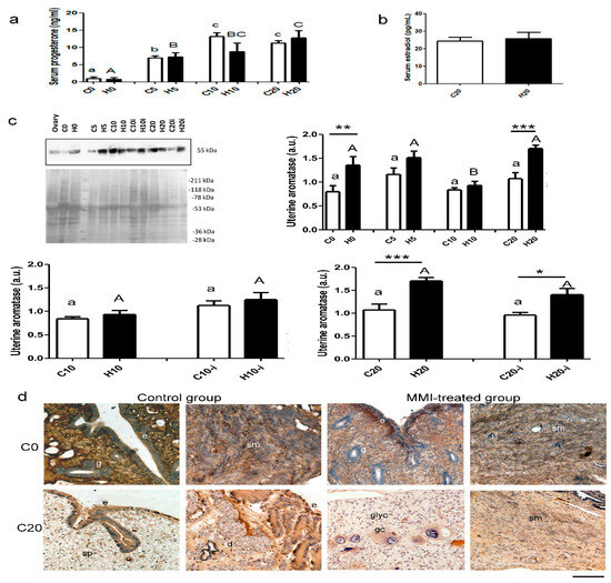 Serum progesterone (a), estradiol (b) levels, and aromatase expression (c) in inter-implantation and implantation (i) sites from the central portion of right uterine horns of virgin (0) and pregnant (5, 10, and 20 days) rabbits grouped into control (C) and MMI-treated (H) groups. Inter-implantation and implantation sites were considered at 10 and 20 days of pregnancy. The ovary was a positive tissue for aromatase Western blot (c). Two-way ANOVAs were applied for each condition (inter-implantation sites during pregnancy, day 10 of pregnancy in inter-implantation vs. implantation sites, or day 10 of pregnancy in inter-implantation vs. implantation sites). Lowercase letters denote control groups and uppercase letters denote MMI-treated groups. Similar letters indicate no statistical significance, and different letters indicate p < 0.05. Differences between control and MMI-treated groups are denoted by * p < 0.05, ** p < 0.01, and *** p < 0.001. Each group had n = 6, except in C20 and H20 for estradiol levels and H0 and C10 for aromatase (n = 5). (d) Immunohistochemical microphotographs of aromatase indicating positive different tissues in color brown in the uterus of rabbits in each group (days 0, 5, 10, and 20). Scale = 100 µm. Abbreviations: epithelium (e), uterine gland (g), decidua cells (d), giant cells (gc), smooth muscle (sm), spongioblast (sp), and glycogen cells (glyc).