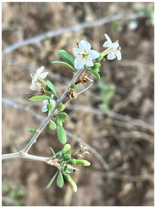 Lycium shawii is adapted to semi-desert and extreme desert climates and is predominantly native to Middle Eastern countries such as Palestine, Jordan, Iraq, Iran, Egypt, and Saudi Arabia, as well as other countries in the Indian subcontinent and some parts of Africa. It is a perennial shrub with many woody branches held erect from the ground, with long and sharp spikey thorns on the stem. Its leaves grow in clusters with white to pale violet flowers [19]. Lycium shawii is identified as a threatened species according to the red list of the IUCN.