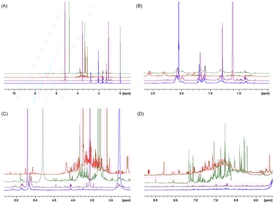 (A) Stacked 1H NMR spectra of L. shawii extracts from δ 0 to 10. Extended view of chemical shift regions is provided from (B) δ 0.5 to 2.7; (C) δ 2.5 to 5.5; and (D) δ 5.5 to 8.6. Spectra were acquired at 800 MHz. Blue: acetone extract; red: water extract; green: methanol extract; purple: ethanol.