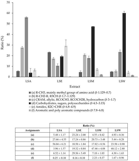 Ratios (%) of six chemical shift assignments calculated from 1D 1H NMR spectral integrations for each L. shawii extract. The column diagram illustrates that different solvents extract distinct types of metabolites, with details presented in the ratio table. Values are expressed as mean ± SD of triplicate measurements (n = 3). Error bars represent the standard deviation of mean values. LSA: acetone extract; LSE: ethanol extract; LSM: methanol extract; LSW: water extract.