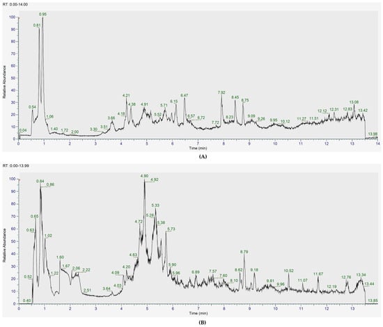 Total ion chromatogram of the pooled samples containing all L. shawii extracts obtained using UHPLC–MS in (A) ESI+ and (B) ESI−modes.
