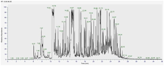 To further examine the metabolites of the L. shawii extracts, UHPLC-ESI-MS (+/−) and GC-MS were subsequently used for a deeper analysis. Figure 4 and Figure 5 show the total ion chromatograms (TICs) of the pooled L. shawii samples obtained using UHPLC-ESI-MS and GC-MS. The individual TICs of the LSW extract per instrument are shown in Supplementary Figures S2–S5.