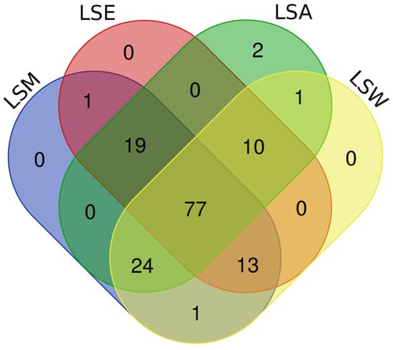 The results revealed a combined total of 148 unique tentatively annotated features across all the L. shawii extracts. The number of features detected in each extract was as follows: 133 in LSA, 120 in LSE, 135 in LSM, and 126 in LSW. Lists of all tentatively identified metabolites and their classifications can be found in Supplementary Tables S1–S3. The Venn diagram shows the distribution of the metabolites detected across the four L. shawii extracts (Figure 6). A total of 77 metabolites were common to all the extracts, highlighting a core metabolome that is extractable regardless of solvent. Two unique metabolites were detected in LSA: cholesterol, 1TMS (C30H54OSi, RT 25.06), and 2-Hydroxybutanedioic acid, 3TMS (C13H30O5Si3, RT 10.32). The LSE, LSM, and LSW extracts showed no unique contributions. Further details on the unique and common metabolites across extracts is available in Supplementary Table S4.