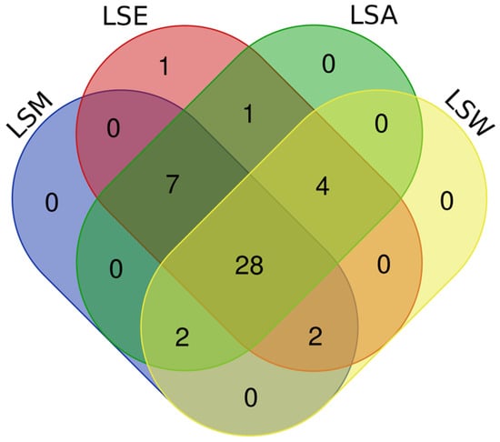 Venn diagram comparing common and unique tentative metabolite identifications between the L. shawii extracts using data obtained through GC-MS and UHPLC-ESI-MS (+/−) combined. LSM, methanolic extract; LSE, ethanolic extract; LSA, acetone extract; LSW, water extract.